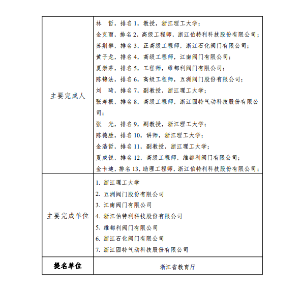 關于浙江石化閥門有限公司擬參與申報2021年度浙江省科學技術獎項目的公示